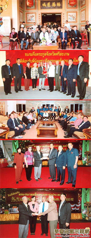 一:爱心访问团一行在紫聃阁就座合影。二:爱心访问团庄金美等赠送礼品予四色菊分会理事长庄舜士接领。三:爱心访问团与素辇庄氏宗亲们在通他粦酒店座谈合影。四:总会访问团庄汉锐,庄儒龙赞助乌汶庄石严宗亲会经费。五:乌汶华侨学校2董事长庄舜鹏接领庄元盛,庄承锦赞助经费。 |